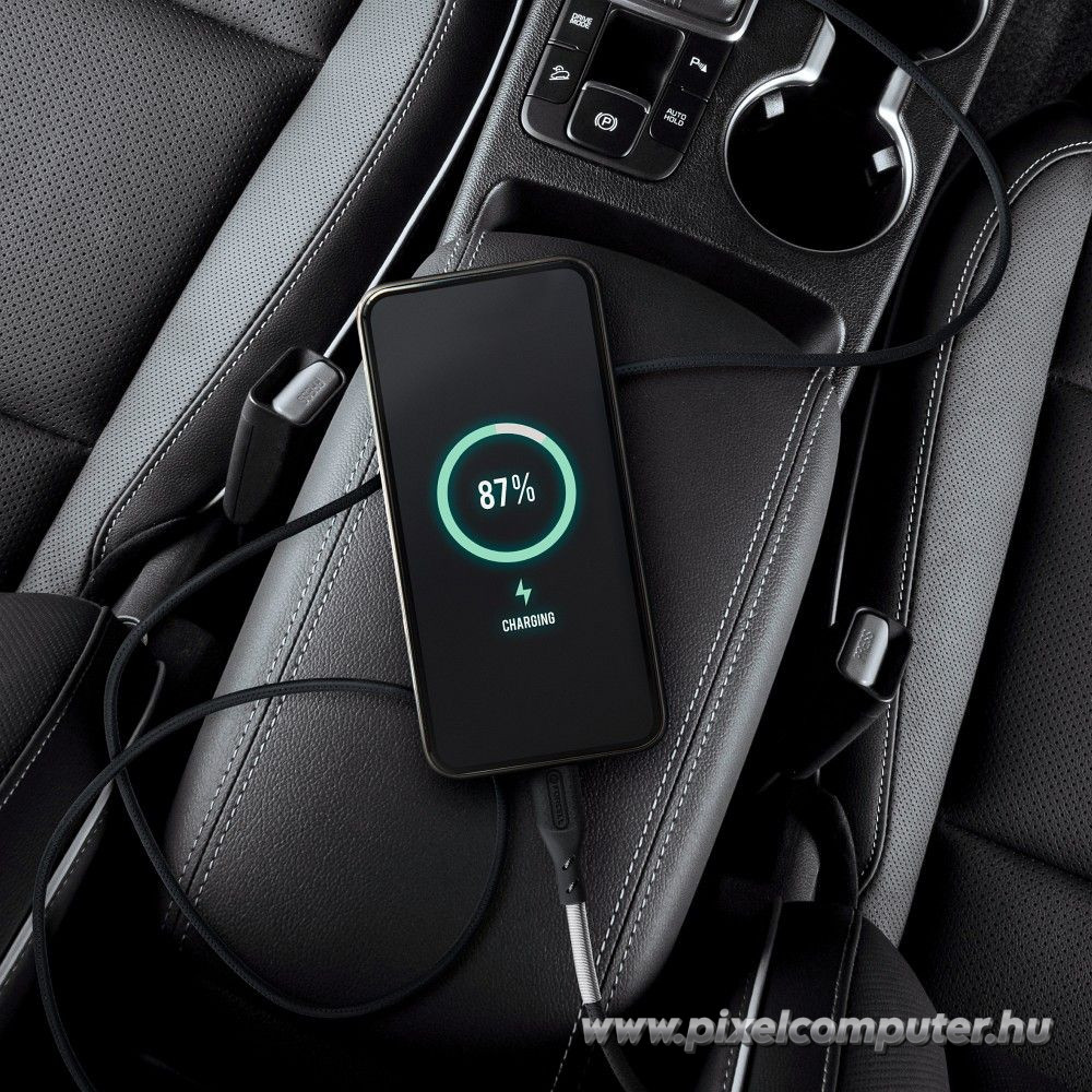 Most nézzük meg, mi teszi igazán strapabíróvá ezt a modellt. A fém fonott borítás jelentősen növeli a mechanikai ellenállóképességet, így a kábel jobban ellenáll a hajlításnak, csavarodásnak és mindennapi igénybevételnek. A karbonhatású, megerősített csatlakozók nemcsak modern megjelenést biztosítanak, hanem stabil illeszkedést is garantálnak hosszú távon. A TPE belső szigetelés rugalmas és tartós szerkezetet biztosít. Ez a kombináció ideális intenzív, akár napi szintű használatra is.